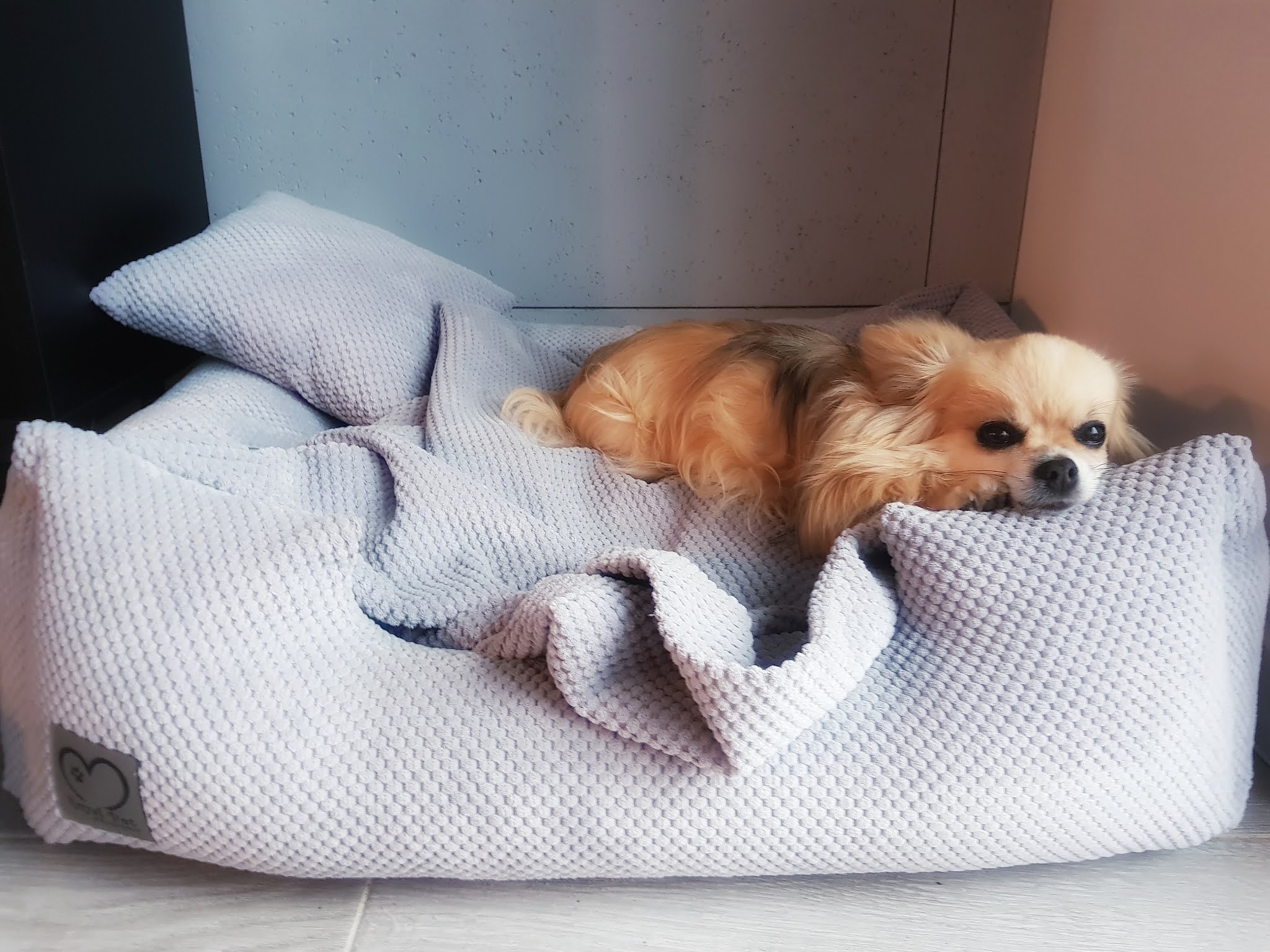 Ale po „przyjeździe” legowiska Premium od Royal Pet, w sumie nigdy się tak nie zdarzyło, żeby wszystkie Cziłki chciały w jednym czasie leżeć na posłaniu. Tu miałam lekki problem bo musiałam ich trochę rozgonić i każdy miał swój czas. Chyba na drugą noc jak już każdy wypróbował, kładliśmy się do łóżka odliczyłam czy wszyscy są i poszliśmy spać. Rano wstałam, zawsze zgarniam ich od razu na ogród wszystkich ale patrzę pod tarasem nie ma Gandzi i Buni .. mowie oho trzeba je zeskrobać z łóżka, śpiochy z dziewczyn są, wchodzę do sypialni zaglądam pod kołdry, nie ma ich, wracam się patrzę dalej ich nie ma, zaczęłam zaglądać do każdego pokoju no nie ma. W końcu zaczęłam obmacywać wszystkie koce bo one lubią się chować ale nie pomyślałam żeby zajrzeć do tego legowiska od Royal Pet. W końcu tak od niechcenia pomacałam przez podpięty kocyk i słyszę burczenie. Odkrywam a dwie Księżniczki się tak wtopiły w poduchę, że nawet nie myślały żeby stamtąd wyjść. Dodam, że te dwie, nigdy nie zmieniają w nocy miejsca, całą noc zawsze w łóżku śpią z nami.